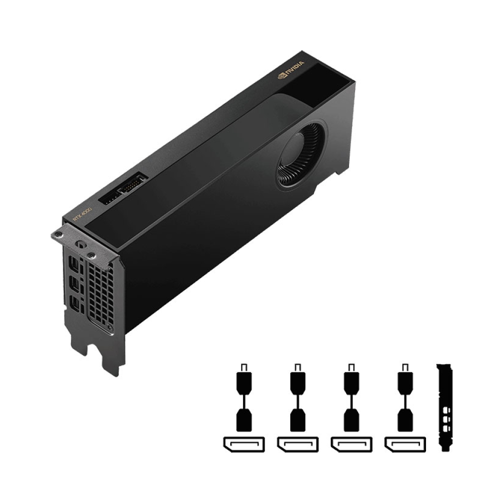 Max simultaneous displays, 4x 4096 x 2160 @ 120 Hz, 4x 5120 x 2880 @ 60 Hz, 2x 7680 x 4320 @ 60 Hz, PNY NVIDIA RTX 4000 ADA SFF, 20 GB GDDR6 ECC, 160-bit Memory Interface, PCI-Express 4.0 x16 Connections : 4x DisplayPort 1.4a, AV1 encode and decode support, DisplayPort with audio, 3D stereo support with stereo connector, HDCP 2.2 support, NVIDIA Quadro® Sync II¹ compatibility Memory Bandwidth : 320GB/s, Power consumption : Total board power: 70W. Form Factor : 2.7" H x 6.6" L, dual slot, Active Thermal Solution.